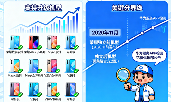 。这些机型最初作为华为子品牌产品推出,因此被纳入了华为官方的鸿蒙系统升级计划中。而在此之后,即荣耀成为独立品牌后发布的所有新机型(如荣耀50系列、60系列、70系列及Magic系列等),则不再支持升级至鸿蒙系统,转而搭载荣耀自家的Magic UI或MagicOS